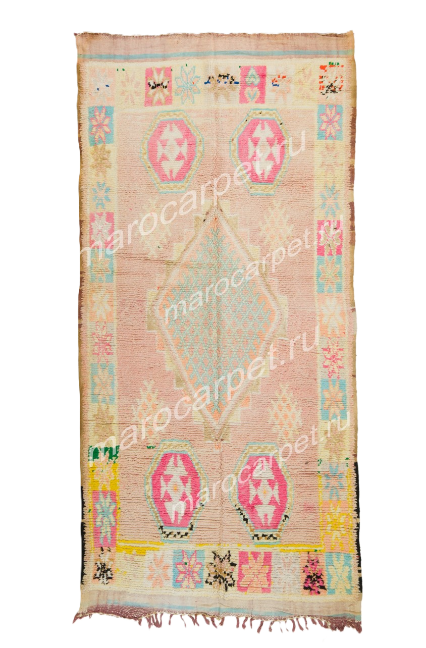 Винтажный ковёр Бужад среднего размера с орнаментами в розово-жёлтой гамме размером 347 × 166 см, сотканный из натуральной шерсти из региона Средний Атлас, Марокко. Ковёр с естественным шармом создаёт тёплую и уютную атмосферу в интерьере.
