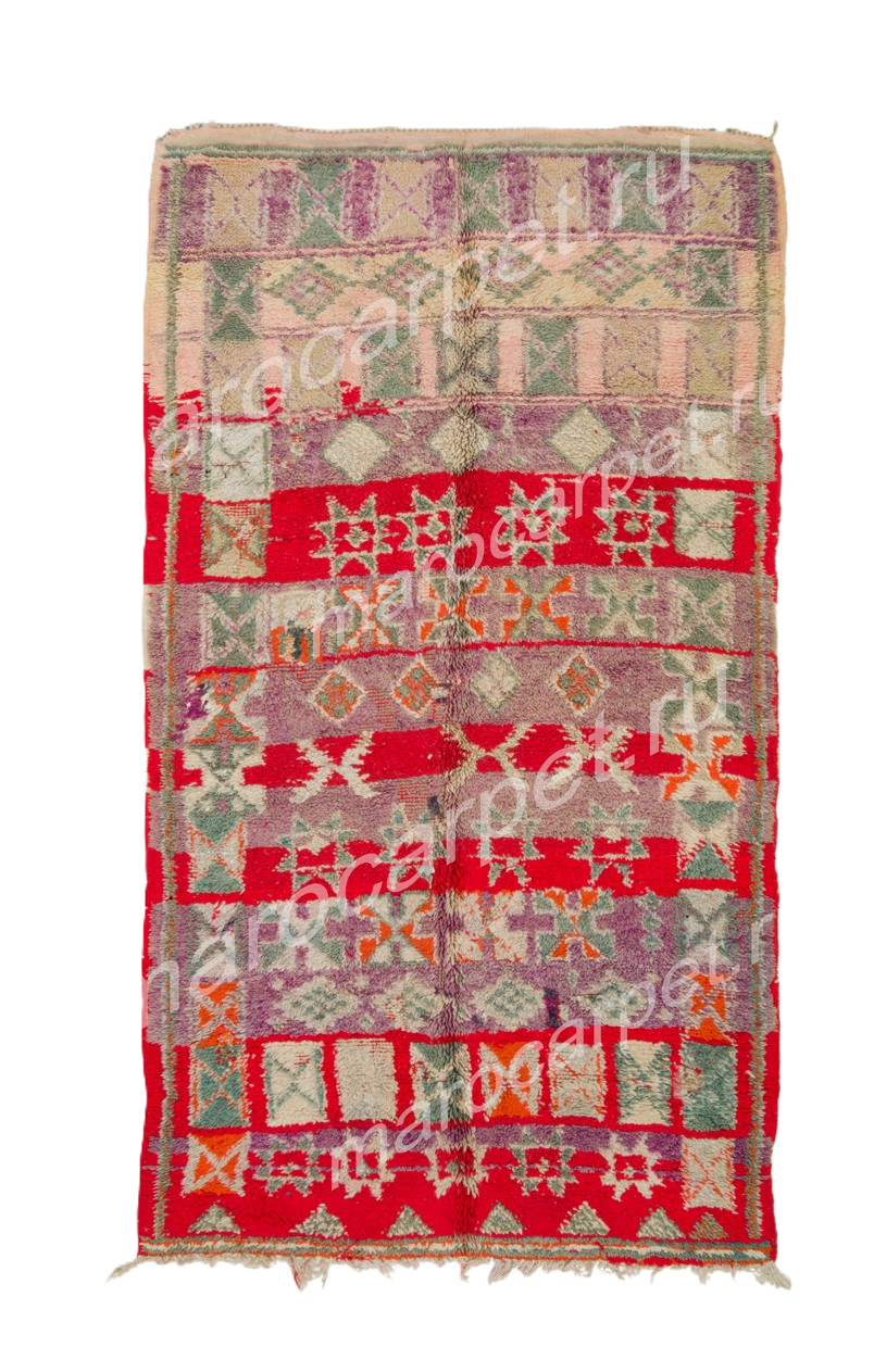 Небольшой винтажный ковёр Бужад с орнаментами в лилово-красной гамме размером 275 × 155 см, выполненный из натуральной шерсти из региона Бужад, Марокко. Эффектный и выразительный дизайн ковра придаёт интерьеру изысканный и стильный акцент.
