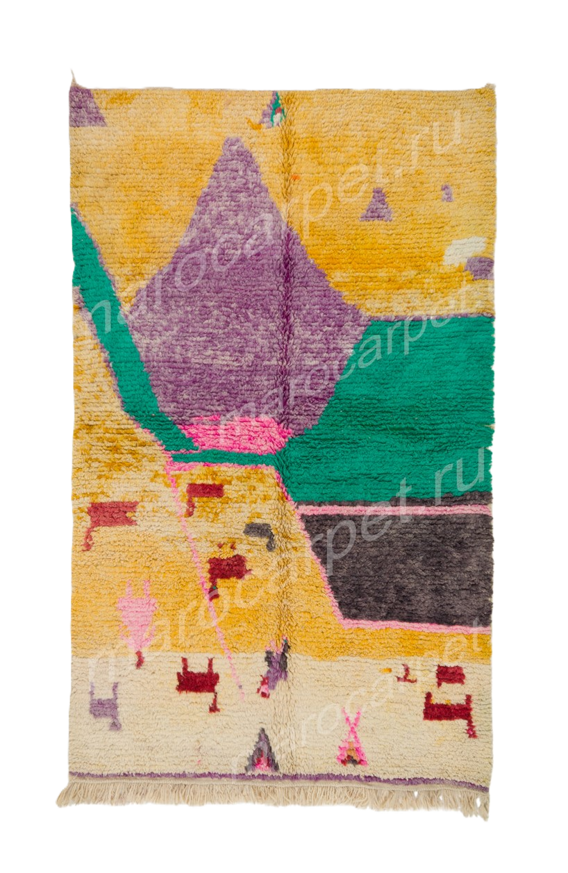 Винтажный ковёр Бужад среднего размера с орнаментами в жёлто-лиловой гамме размером 270 × 162 см, выполненный из натуральной шерсти из региона Бужад, Марокко. Яркая цветовая гамма ковра станет выразительным акцентом и оживит интерьер.