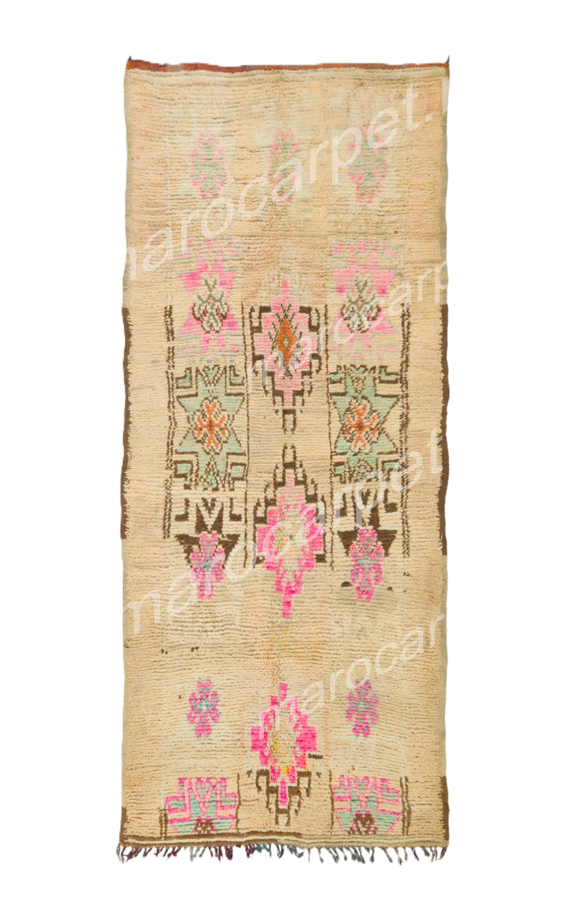 Винтажный ковёр Бужад среднего размера с орнаментами в таупово-розовой гамме размером 322 × 135 см, выполненный из натуральной шерсти из региона Бужад, Марокко. Современные орнаменты придают ковру выразительный характер и делают его стильным элементом интерьера.