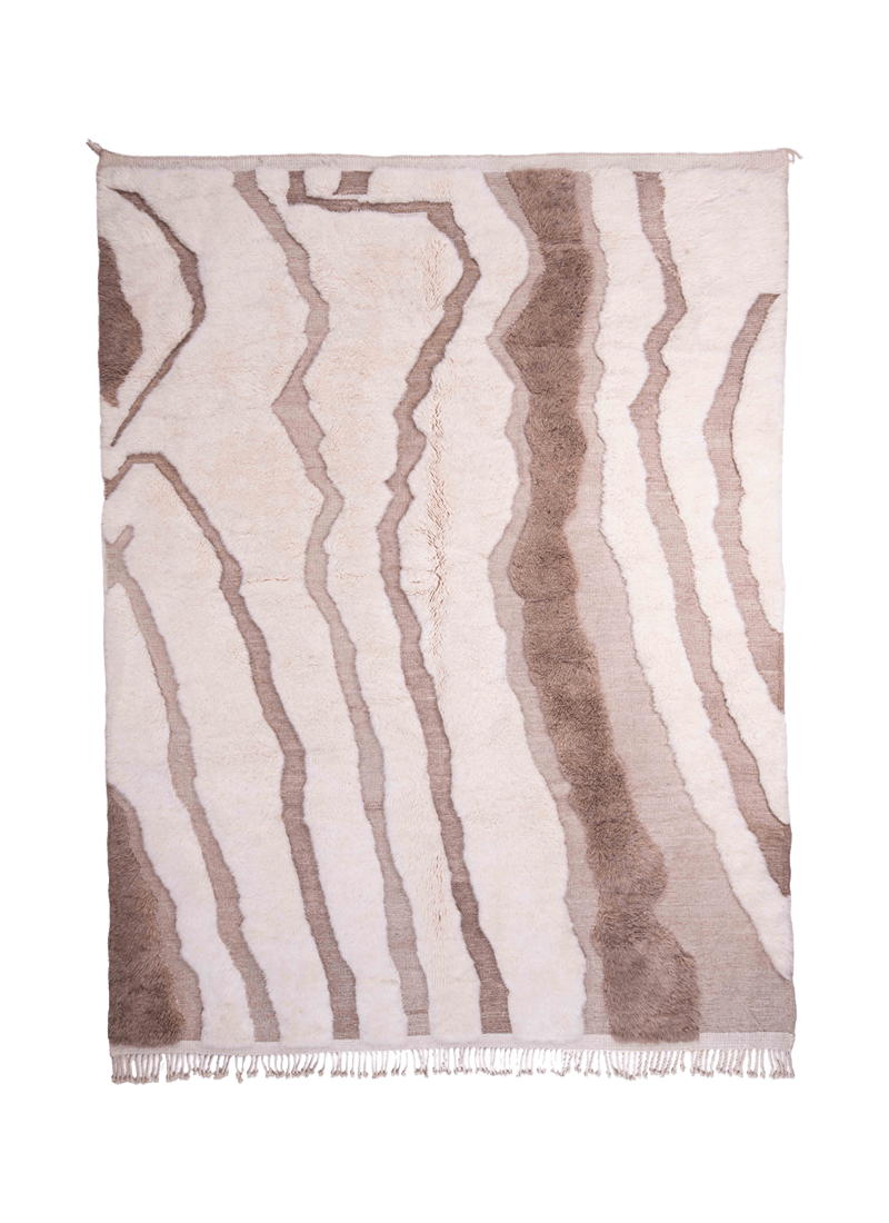 Берберский ковёр Bitrame с рисунком, вдохновлённым линиями ручьёв. Дизайн построен на плавных, извилистых линиях, которые проходят по поверхности ковра и создают ощущение движения воды. Эти линии, выполненные в технике плоского ткачества, формируют лёгкую фактуру, придающую рисунку глубину и живую динамику.