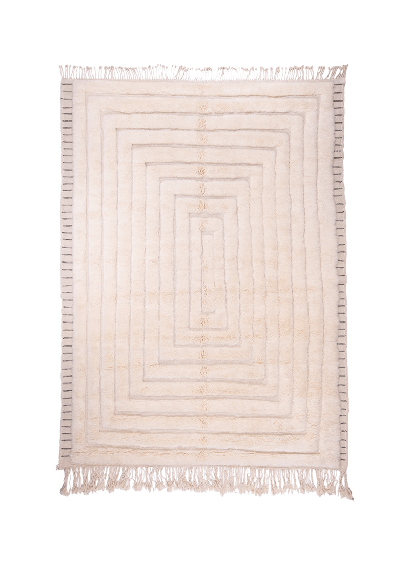 Ковёр изготовлен из высококачественной натуральной шерсти из Марокко и сочетает мягкую, тёплую фактуру с выразительным графичным рисунком.